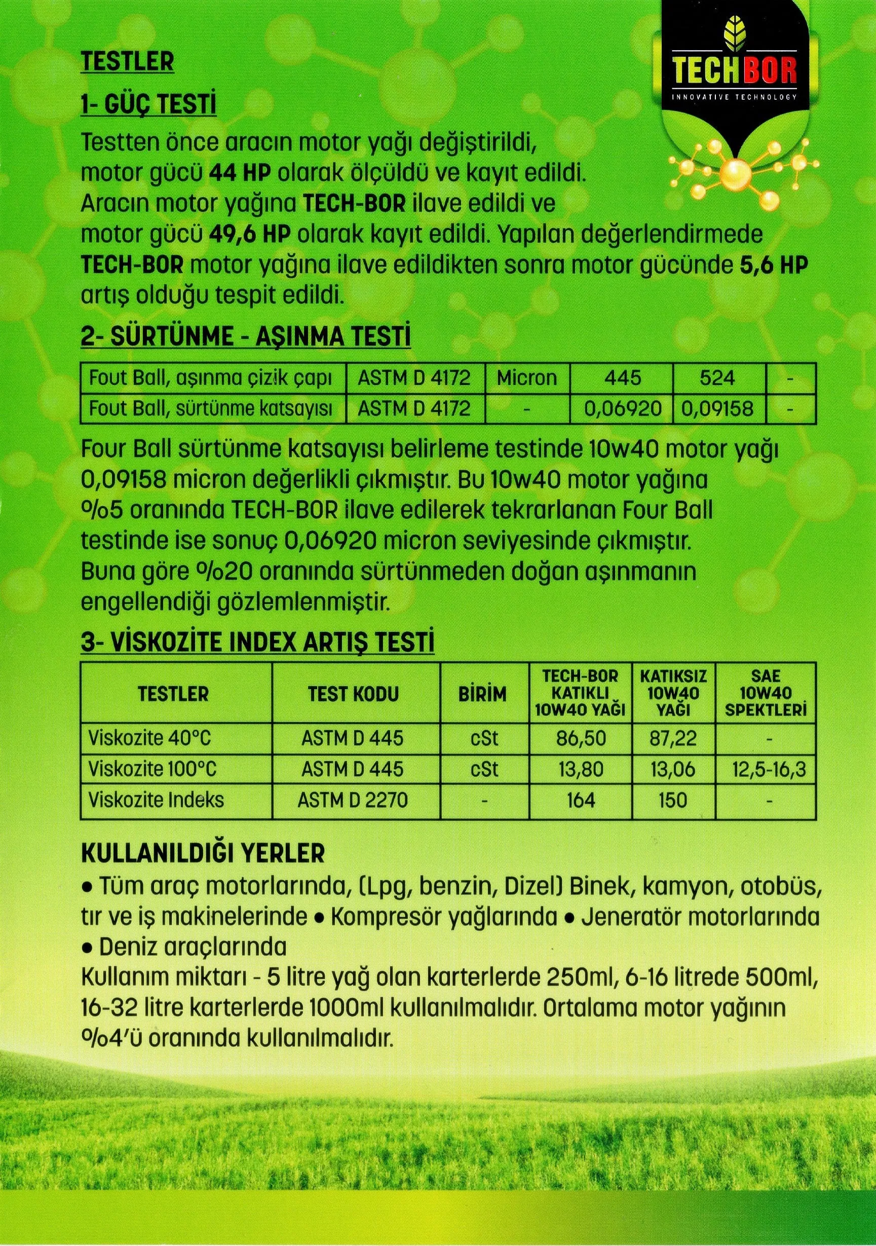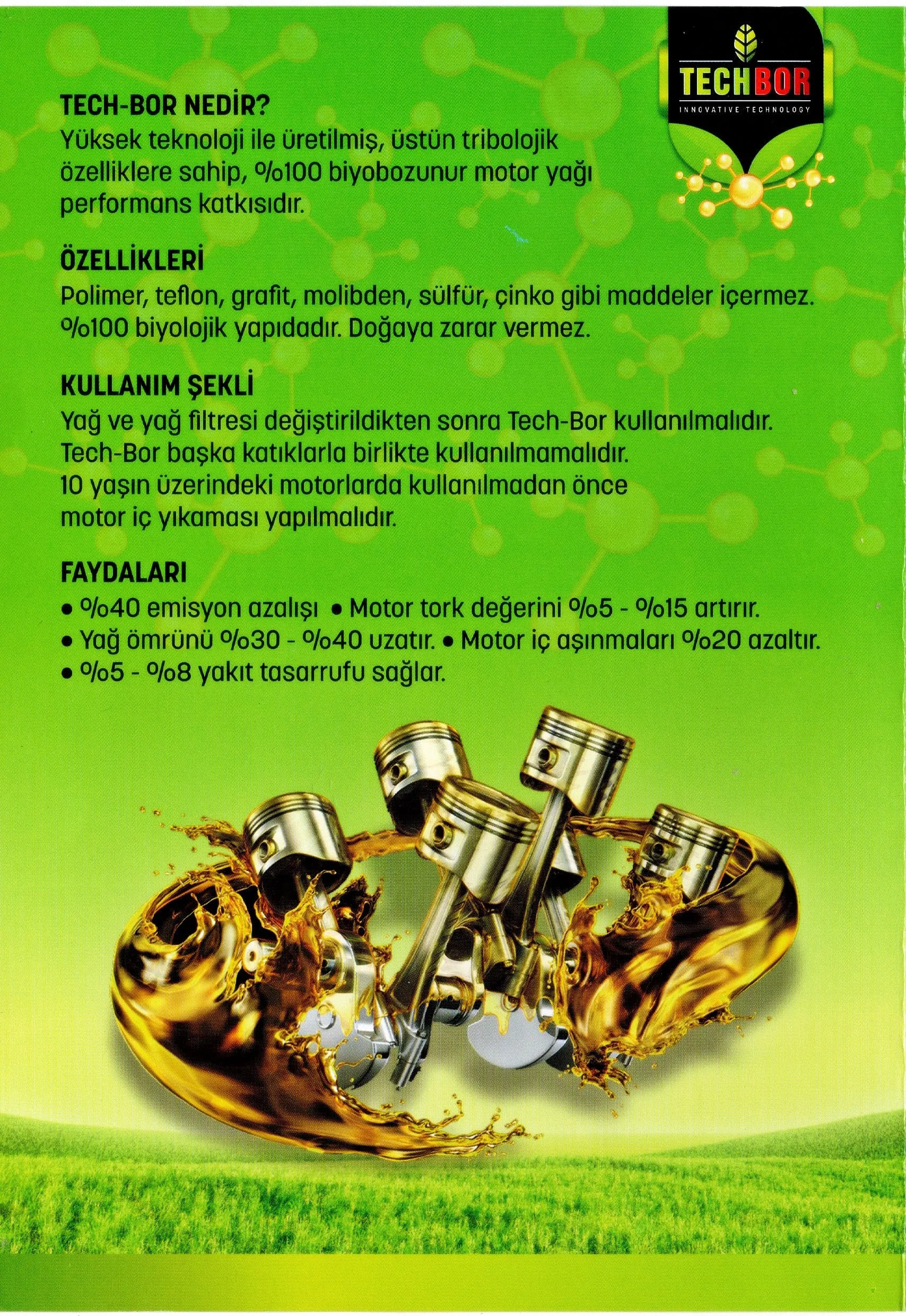 Tech-Bor, yüksek teknoloji ile üretilmiş, üstün tribolojik özelliklere sahip %100 biyobozunur motor yağı performans katkısıdır.