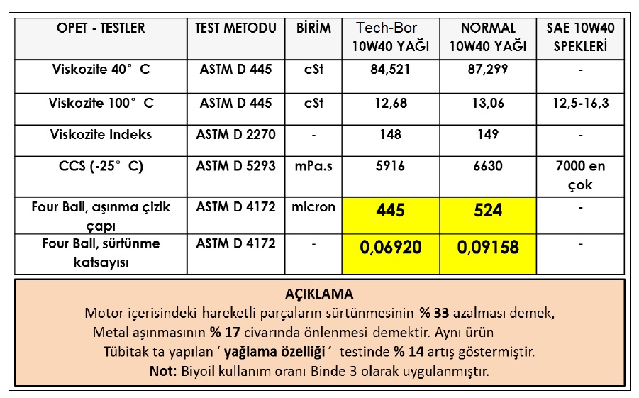 Tech-Bor, içerisindeki yağ asitlerinin polaritesi, yağın yağlayıcılığını ve yüzeylerin tribolojik özelliklerini artıran moleküler filmi oluşumunu sağlamaktadır.